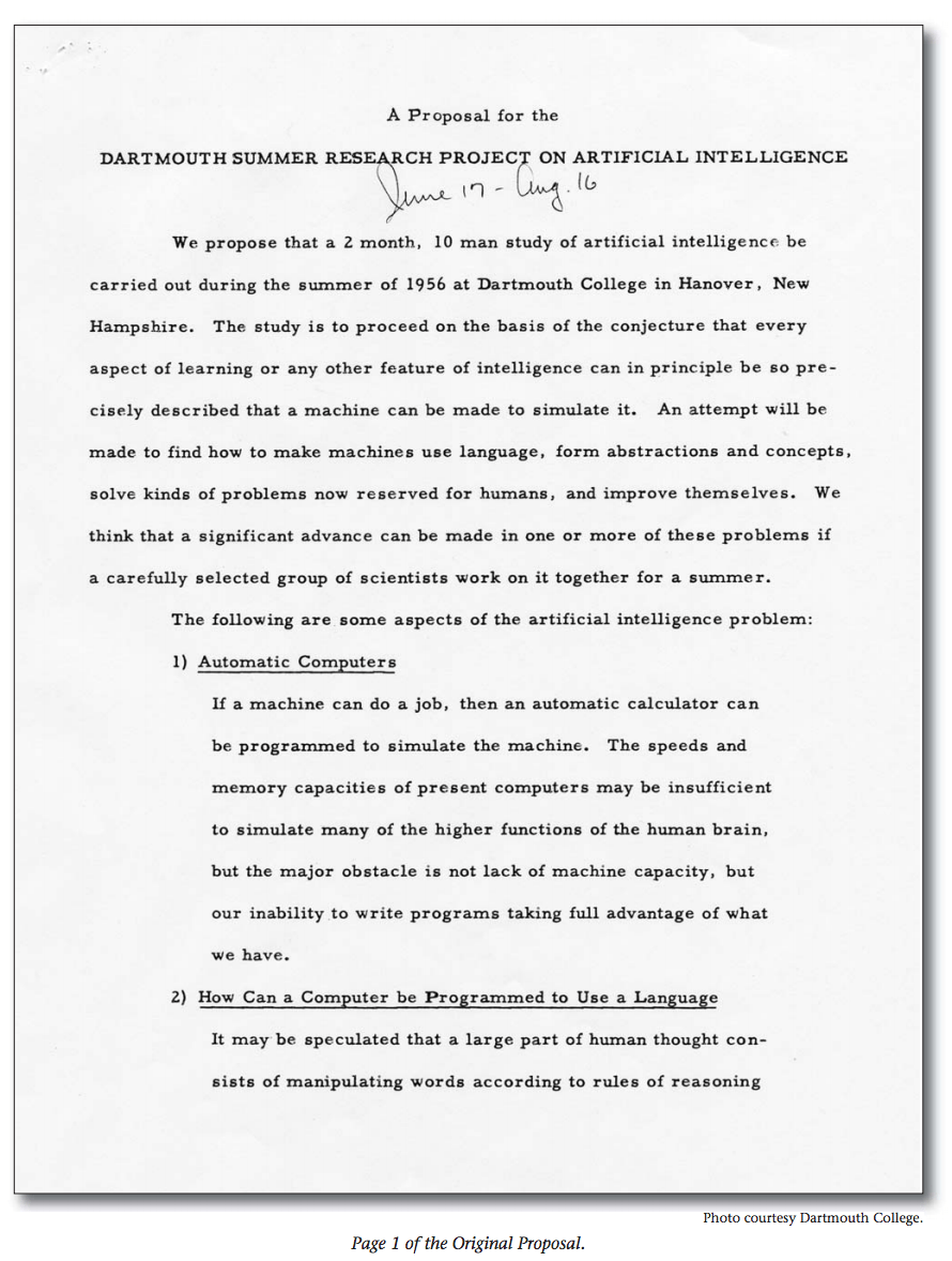 Die dartmouth conference war ein forschungsprojekt, das im sommer 1956 von john mccarthy, marvin minsky, nathaniel rochester, und claude shannon am dartmouth college in hanover, new hampshire, beantragt, geplant und durchgeführt wurde.. Don't just take in knowledge, create it. Die dartmouth conference war ein forschungsprojekt, das im sommer 1956 von john mccarthy, marvin minsky, nathaniel rochester, und claude shannon am dartmouth college in hanover, new hampshire, beantragt, geplant und durchgeführt wurde. It examines some main themes of fields of research of the period, including neural networks, the theory of computability, creativity and ….. Morin '24 in dartmouth alumni magazine, examine the dartmouth college case briefs, and